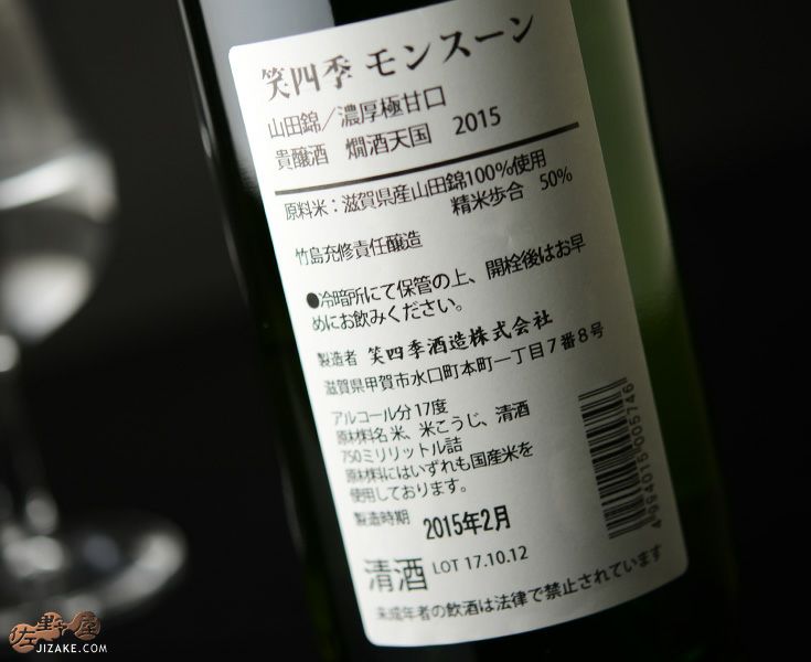 他の画像を見る 帰ってきた燗酒天国!2015年ヴィンテージのモンスーン山田錦! ◇笑四季 モンスーン 燗酒天国 山田錦 2015 750ml 販売価格 ¥ 1,925 税込 在庫切れ 詳細を見る お気に入りに登録する